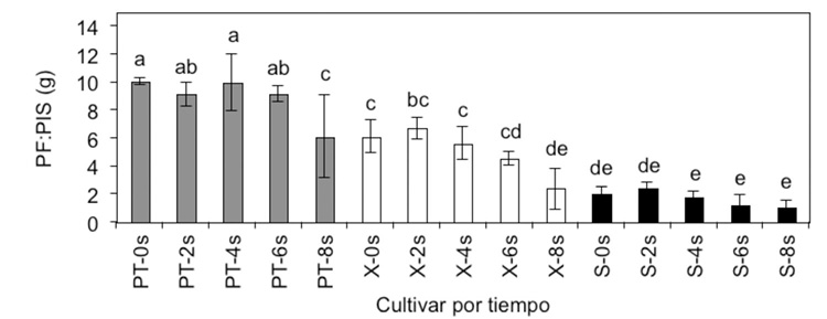 Al analizar la influencia de los tiempos de inmersión en la relación del PF: PIS, se observó una disminución en estas relaciones para los 8 s (Figura 5). La mayor producción de biomasa por gramo de semilla la obtuvo la variedad País Tuxpeño con una relación 1:10,05. En X´nuuknal la mayor producción de biomasa por gramo de semilla fue de 1:6,70 cuando las semillas fueron sumergidas por 2 s y para Sinaloa la mejor relación fue 1:2,41 para este mismo tiempo de inmersión.