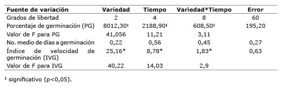 El porcentaje de germinación (PG) y el índice de velocidad de germinación (IVG) mostraron diferencias significativas entre cultivares, tiempos de inmersión e interacción de ambos (p≤0,05) (Cuadro 2); únicamente en el número medio de días a germinación (NMDG) no hubo respuesta significativa. En promedio todas las semillas germinaron entre los cuatro y cinco días después de la siembra.