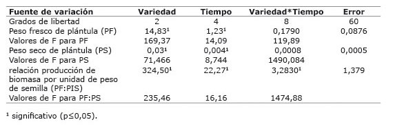 Las variables evaluadas en las plántulas fueron: peso fresco (PF), que se obtuvo registrando el peso de la plántula completa (vástago + raíz) de todas las semillas germinadas; peso seco (PS), el cual se determinó después de secar las plántulas de doce días después de la siembra en una estufa a 65 °C±2 por tres días; por último se obtuvo la relación producción de biomasa por unidad de peso de semilla (PF:PIS). Los resultados obtenidos fueron analizados estadísticamente con el programa Statgraphic Plus (Fernández-Palacín et al., 2000) realizando análisis de varianza, comparación de medias por Tukey (p<0,05) y análisis de regresión.