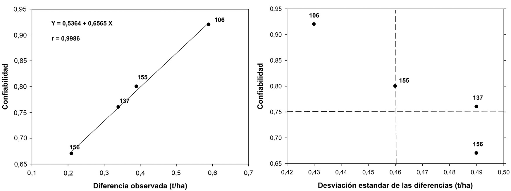 La confiabilidad es una medida que además de evaluar la superioridad en rendimiento con respecto al testigo, evalúa la variabilidad de la respuesta (Córdova et al., 1993). La confiabilidad está directamente relacionada con la diferencia observada en relación al testigo, es decir a mayor confiabilidad mayor diferencia observada; por otro lado, la confiabilidad está inversamente relacionada con la variabilidad de las diferencias; estos resultados concuerdan con los obtenidos en otros estudios (Córdova et al., 1993; Córdova et al., 2007; Camargo et al., 2002; Camargo et al., 2003) (Figura 1).