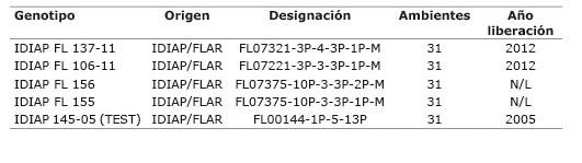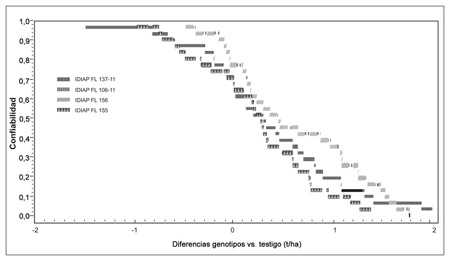 La confiabilidad o respuesta normalizada de los cuatro genotipos evaluados se presentan en el Cuadro 3. Los cuatro genotipos IDIAP FL 106-11, IDIAP FL 137-11, IDIAP FL 155, e IDIAP FL 156, presentaron una confiabilidad promedio de 0,79; 0,75; 0,75 y 0,74, respectivamente. La probabilidad normalizada del IDIAP FL 106-11 representa una respuesta diferencial en rendimiento mayor que cero, con respecto al IDIAP 145-05, en ocho de cada diez casos sería superior. Una confiabilidad baja RNi < 0,6, representa en promedio un riesgo similar para el agricultor con respecto al cambio tecnológico que representa la siembra del nuevo genotipo respecto al testigo IDIAP 145-05.
