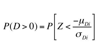 La ecuación anterior representa la probabilidad de que cuando la diferencia entre cultivar nuevo y el testigo sea mayor a cero, la probabilidad Z es menor al producto de la desviación de la diferencias de las medias sobre la desviación de la diferencias de la desviación estándar.