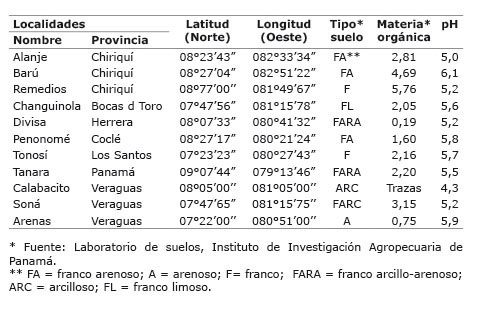 En todas las localidades (Cuadro 1), el IDIAP trabajó con un diseño de bloques completos al azar con tres repeticiones; cada unidad experimental constaba de 10 m2 y se evaluó el rendimiento (t/ha). Las características agronómicas y la reacción a plagas y enfermedades se evaluaron siguiendo los estándares establecidos para la evaluación de germoplasma de arroz a nivel internacional. Sin embargo, para fines de este estudio únicamente se consideró la variable rendimiento de grano.