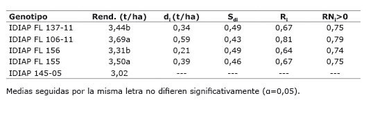 Se puede observar, como el coeficiente de regresión (bi) de estos genotipos están muy cercanos a 1,0 y la desviación de los cuadrados medios a cero; indicando ambos parámetros, que estos genotipos presentaron buena estabilidad fenotípica para la variable rendimiento de grano (Cuadro 4). Con respecto a la estabilidad de los genotipos, Eskridge y Mumm (1992) y Eskridge et al. (1993), demostraron que la confiabilidad es una medida que está relacionada con algunos parámetros de estabilidad, como el coeficiente de regresión (bi) de Finlay y Wilkinson (1963), la desviación del cuadrado medio (Sdi) de Eberhart y Russell (1966) y la varianza de estabilidad de Shukla (1972).