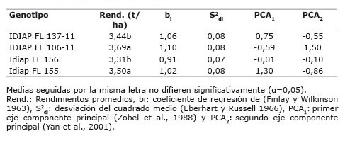 Los modelos multivariados son utilizados en la actualidad para explicar la interacción genotipo ambiente e identificar genotipos con mejor estabilidad como el modelo AMMI (Zobel et al., 1988). En este caso, se pudo identificar el genotipo IDIAP FL 156, como el que menos interaccionó con el ambiente, por presentar puntuaciones AMMI1 cercanas a cero, en el primer eje del componente principal (PCA1). El modelo Biplot GGE (Yan et al., 2000), destaca al genotipo IDIAP FL 156 como el más estable por mostrar puntuaciones cercanas a cero en el segundo eje del componente principal (PCA2), similar a lo reportado por Camargo et al. (2011), quienes encontraron un 95,2% de coincidencia entre AMMI1 y Biplot GGE en la identificación de genotipos estables.
