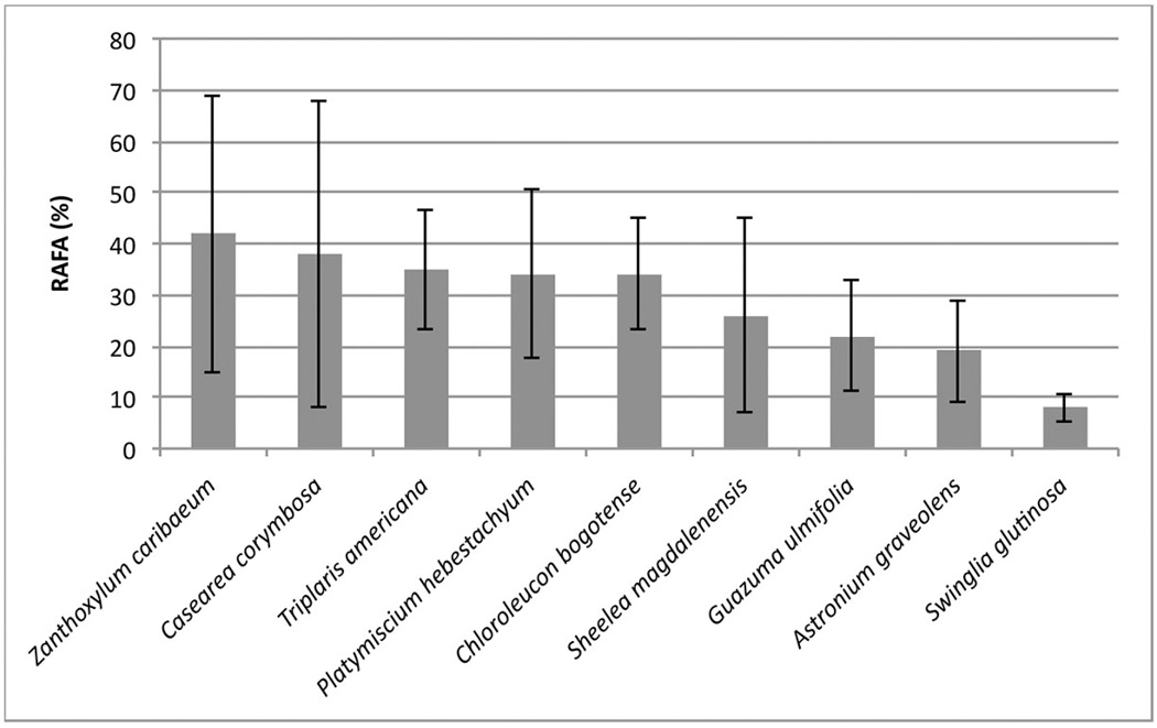 Los valores de RAFA transmitida para algunas especies es alto en comparación con las demás. Cabe destacar especies como dormilón (Pentaclethra macroloba) (57%), cují (Prosopis julioflora) (48%), algarrobo hediondo (Anagris foetida) (47%). Se observó similar tendencia en los valores de oclusión: totumo (Crescentia cujete) (96%), algarrobo hediondo (Anagris foetida) (92%), ondequera (Casearea corymbosa) (92%), chicalá (Tabebuia chrysantha) (92%) y mortesino (Ocotea amazónica) (91%).