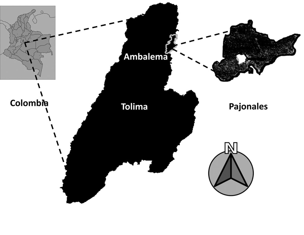 El estudio se realizó entre agosto de 2009 y agosto de 2010 en la hacienda Pajonales, perteneciente a la Organización Pajonales S.A., localizada en el municipio de Ambalema, Tolima, Colombia, parte alta de la cuenca del Magdalena. El sitio de estudio consistió en 54 ha localizadas entre las coordenadas 4° 45’ 25,9” N y 74°,52 20,8” O a una distancia de 15 km del casco urbano del municipio de Ambalema (Figura 1). La zona presenta una precipitación media anual de 1270 mm, una temperatura media de 28°C y una altitud de 300 m, ubicándose en una zona de vida de bosque seco tropical (Holdridge, 1967). La mayor parte de los suelos corresponden a vertisoles, inceptisoles y molisoles. Los sistemas productivos de la hacienda Pajonales están dirigidos a diversas actividades de tipo agropecuario, entre ellas la ganadería.