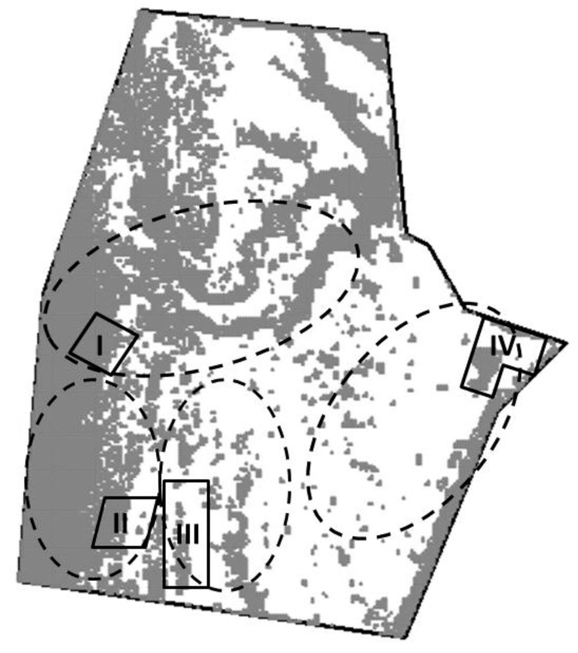 La evaluación de la cobertura arbórea se realizó en la época lluviosa, octubre a diciembre de 2009. Se delimitaron cuatro parcelas en el potrero de diferente tamaño, así: I y II de 7000 m2 cada una, parcela III de 15 000 m2 y IV de 12 000 m2. Estas eran representativas de la distribución del componente leñoso de cada una de las áreas diferenciadas por estimación visual según la densidad arbórea (Figura 2).