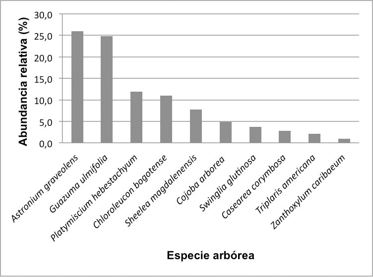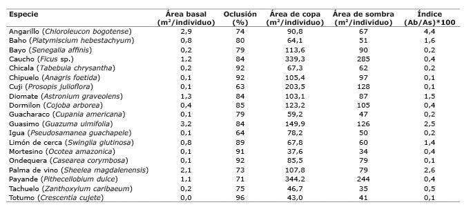 Las especies arbóreas que presentaron mayor valor de la relación área basal:área de sombra (Ab/As) fueron Chloroleucon bogotense, Sheelea magdalenensis, Guazuma ulmifolia, Astronium graveolens, Swinglia glutinosa y Platymiscium hebestachyum (Cuadro 3).