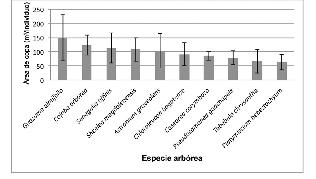 Las especies con mayor índice de valor de importancia (IVI) presentaron valores medios y altos en área de copa, tal como G. ulmifolia (149,9 m2/individuo), A. graveolens (103,1 m2/individuo) y C. bogotense (90,8 m2/individuo) (Figura 4).