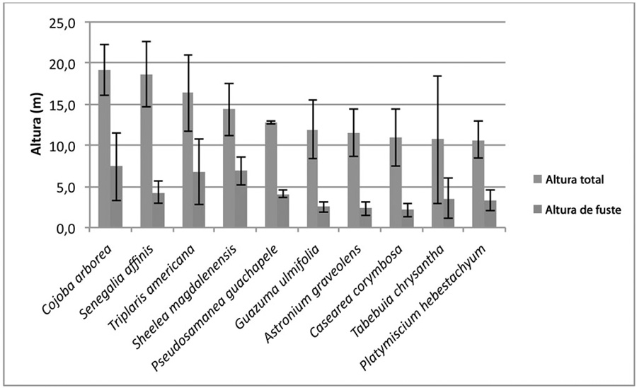 Cojoba arborea, Senegalia affinis, Pithecellobium dulce, Triplaris americana, Ficus sp., Sheelea magdalenensis y Pseudosamanea guachapele fueron las especies con mayor altura total y de fuste promedio (19,2 y 7,4 m; 18,6 y 4,3 m; 16,6 y 2,6 m; 16,4 y 6,8 m; 14,4 y 2,5 m; 14,3 y 6,9 m y 12,7 y 4,1 m, respectivamente; Figura 5).