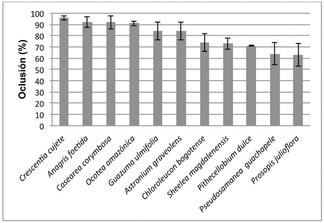 En contraste, las especies de menor oclusión de copa, es decir, aquellas que generan una sombra más rala a la pastura fueron Astronium graveolens, Pseudosamanea guachapele, Sheelea magdalenensis, Pithecellobium dulce y Prosopis juliflora con 74, 74, 73, 71 y 63%, respectivamente (Figura 6). Estos datos sugieren que en el momento de establecer o mantener especies arbóreas en las pasturas se debe tener en cuenta su efecto de interferencia de luz para fotosíntesis al estrato herbáceo, originado por las copas y la densidad de la especie que impacta la competitividad por agua y nutrientes del suelo (Daccarett y Blydenstein, 1968). Lo anterior permite direccionar los diseños de sistemas silvopastoriles hacia modelos que involucren especies leñosas con valores bajos para oclusión de copas, facilitando de esta manera el buen desarrollo de las especies herbáceas presentes bajo el dosel a partir de buena disponibilidad de luz solar.
