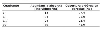 La cobertura arbórea varió entre el 23,4 y 77,4% a nivel de parcelas. Sin embargo, se encontró una alta heterogeneidad de la sombra en cada cuadrante, presentando un porcentaje de cobertura entre 5 y 35,2% (Cuadro 1).
