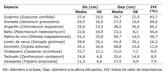 El DAP para G. ulmifolia varió entre 15 y 70 cm, lo cual está dentro del valor reportado por Zapata-Arango (2010) en los Municipios de Muy Muy y Matiguás, Departamento de Matagalpa, Nicaragua (promedio de 35,1 cm). La especie A. graveolens presentó un valor promedio para DAP menor a 60 cm, lo cual indica que hay muchos individuos pequeños, probablemente jóvenes (Arends et al., 2005); es decir, existe alta capacidad de regeneración natural de esta especie. La dominancia relativa muestra que el 78% del área basal corresponde a cinco especies: 25,3% guácimo (Guazuma ulmifolia), 15,8% diomate (Astronium graveolens), 16,4% angarillo (Chloroleucon bogotense), 3,9% baho (Platymiscium hebestachyum) y 16,3% palma de vino (Sheelea magdalenensis). El diámetro basal de G. ulmifolia en el potrero de estudio (37 cm; Cuadro 2) se encuentra dentro del rango de los datos de un estudio realizado en un potrero de Chiapas, México, donde se reporta para diámetro basal de G. ulmifolia valores entre 3 y 60 cm (López-Merlín et al., 2003).