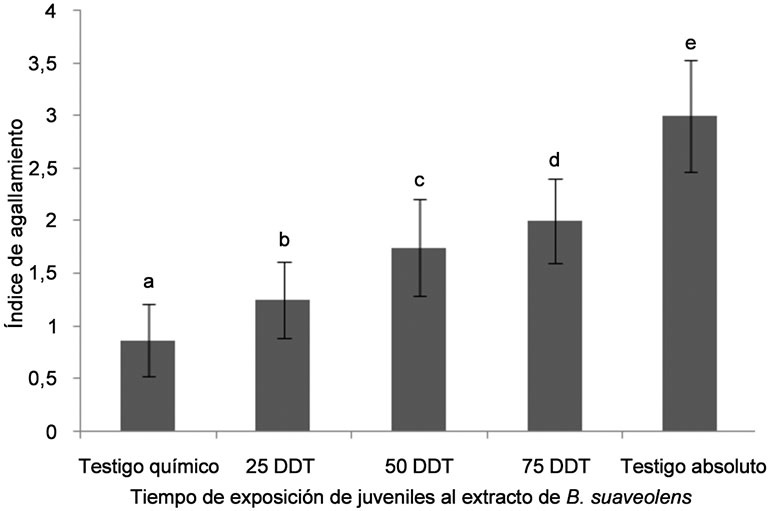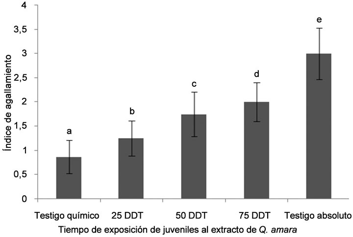 El IA en este estudio fue en promedio menor o igual a 2, esto podría deberse a las propiedades de las cuasinas y neocuasinas las que han demostrado ser capaces de inhibir la alimentación de organismos plagas como los insectos (Hilje y Stansly, 2001). Niveles de agallamiento menores a dos son considerados bajos, ya que de acuerdo con Canto-Saénz (1983), son más tolerantes, lo que sugiere que el extracto reduce el IA a niveles que son tolerables por la planta.