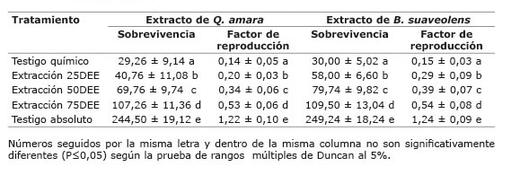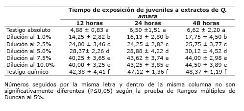 Niveles de mortalidad similares a los encontrados en este estudio fueron reportados previamente por López (2010), quien al evaluar la mortalidad in vitro de Radopholus similis observó un 86% de mortalidad utilizando extractos de Q. amara. Estos altos niveles de mortalidad han sido atribuidos por Coats (1994) a metabolitos secundarios presentes como aminoácidos y alcaloides. De este último, se destaca la cantina que posee propiedades citotóxicas, que causan daño a las células de organismos vivos (López y Pérez, 2008).