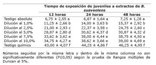 Las poblaciones de nematodos expuestas al extracto por 12, 24 y 48 horas, presentaron reducciones significativas (P<0,05) en todas las concentraciones evaluadas, en comparación con el testigo absoluto, lo que demuestra sus propiedades nematicidas. Los promedios de mortalidad más altos se lograron a las 48 horas en las diluciones al 7,5 y 10%, donde se obtuvo un porcentaje de 88 y 89% de nematodos muertos respectivamente. Se comprobó que los factores, tiempo y concentración del extracto fueron fundamentales en la mortalidad de nematodos (Cuadro 1). La viabilidad de los juveniles decreció en la medida que se utilizaba una dilución más alta (10%) por un periodo de tiempo más largo (48 h). El testigo absoluto (agua destilada) presentó el nivel más bajo de mortalidad con 13%, siendo superada por todos los tratamientos evaluados. El testigo químico (oxamil) presentó el nivel más alto de mortalidad con 96% (Cuadro 1).