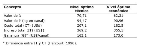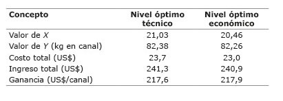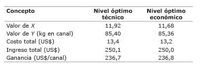 Por su parte, el costo total (CT) correspondiente al NOT, se dedujo al multiplicar 2,92885144 por 70,71 kg, lo que dio como resultado US$ 207,1 (Cuadro 2). El ingreso total (IT) se obtiene al multiplicar la cantidad producida y/vendida por el precio de venta; así, US$ 3,908 multiplicado por 94,47 kg de carne en canal, el resultado es US$ 369,2 (Cuadro 2). Los valores de la columna del nivel óptimo económico, del Cuadro 2, se obtienen de forma similar a los del nivel óptimo técnico.