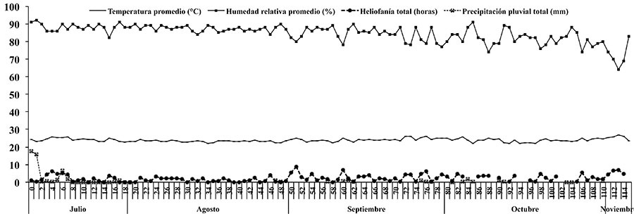 Las condiciones climáticas durante los 115 días que duró el experimento, fueron normales para el crecimiento habitual del cultivo e intensidad de las enfermedades evaluadas (Figura 1), una temperatura promedio de 24,11°C, humedad promedio de 85,26%, heliofanía total de 237,60 horas e precipitación pluvial total de 54,70 mm. Estas condiciones climáticas son similares a las del año 2010 en la misma localidad, comparadas con los trabajos de Garcés-Fiallos et al. (2012) y Garcés-Fiallos (2013), quienes reportan una temperatura promedio de 23,88°C, heliofanía total de 116,30 horas y precipitación pluvial de 55 mm.