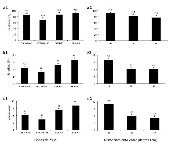 Para el caso de la severidad (%) (Figura 2b) y el número de lesiones/cm2 de la roya (Figura 2c), estas dos variables tuvieron comportamiento diferencial similar entre los cuatro genotipos y los tres distanciamientos, en el estadío fenológico R8. La línea EVG 06-103 con 4,8% (Figura 2b1) y 4,4 lesiones/cm2 (Figura 2c1) se comportó como el genotipo superior en comparación a los demás materiales. El material con mayor cantidad de roya fue la línea SER-08, con 10,1% y 10,2 lesiones/cm2.