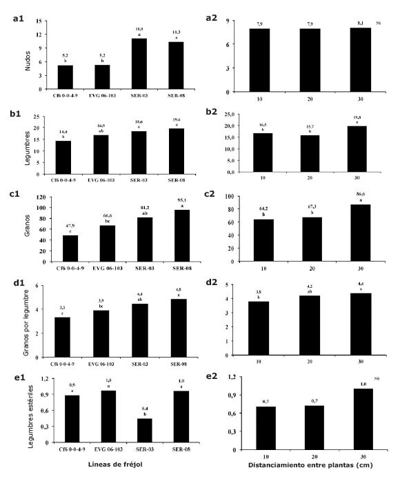 En lo referente al número de nudos por planta las líneas SER-08 y SER-03 con valores entre 10,3 y 11,0 nudos, fueron los genotipos estadísticamente superiores, en comparación con los promedios de 5,2 nudos encontrados en los demás genotipos (Figura 3a1). Este hecho posiblemente se debió al hábito de crecimiento del germoplasma estudiado (determinado e indeterminado), ya que en la literatura también se pueden encontrar valores entre 6,4 y 7,1 nudos en el cultivar Iraí de fréjol de hábito de crecimiento determinado (Jauer et al., 2003) y entre 11,0 y 17,8 nudos en fréjol chino de hábito de crecimiento indeterminado (Matos-Filho et al., 2009).