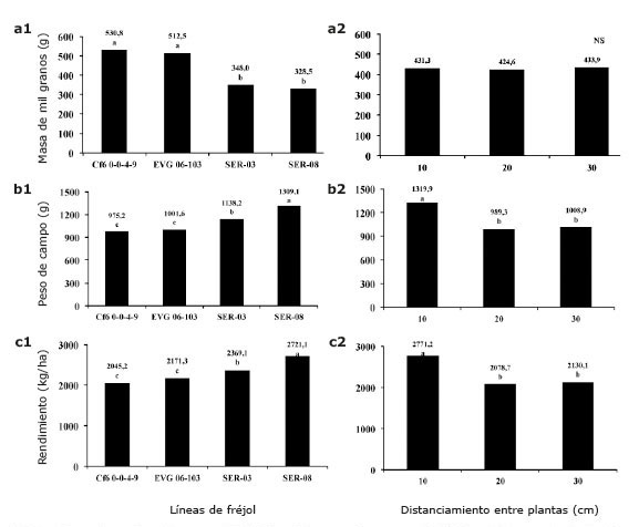 Se encontraron también valores de 328,5 y 348,0 g en los genotipos de crecimiento indeterminado SER-08 y SER-03, los cuales fueron inferiores a los obtenidos en los materiales de crecimiento determinado, siendo estos 512,5 en EVG 06-103 y 530,8 g en el genotipo Cf6 0-0-4-9 (Figura 4a1). Este hecho sin dudas se debió al tamaño del grano, ya que estos materiales son clasificados por poseer tamaño de grano grande (EVG 06-103) y mediano (SER-03 y SER-08) (Garcés-Fiallos, 2011). A su vez, la masa de mil granos no fue influenciado por los tres distanciamientos entre plantas estudiados (Figura 4a2), lo que concuerda con Bezerra et al. (2012) y Shimada et al. (2000).