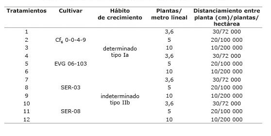 El área experimental en la que anteriormente se estableció el cultivo de arroz, fue de 494,5 m2 constituidos por 36 parcelas de 7,5 m2, divididas en cuatro hileras. La preparación de terreno se realizó mediante un pase de arado y dos de rastra, tres días antes de la siembra. Se utilizaron semillas de las líneas promisorias de fréjol desarrolladas por la UTEQ, de hábito de crecimiento determinado tipo Ia Cf6 0-0-4-9 (obtenidas del cruzamiento Cf6: INIAP-473 x EVG-6-248) y EVG 06-103 (obtenida a partir de la variedad EVG-06 de la empresa Ecuavegetal), y de crecimiento indeterminado tipo IIb, SER-03 y SER-08 (proyecto de la UTEQ: UICYT-DAGA-4c-1) 2009-11) de flor blanca, obtenidas por el método genealógico. Las semillas fueron previamente desinfectadas con carbendazim (ingrediente activo) en dosis de 3 ml por cada kilogramo de semillas. Se sembró el 13 de julio de forma manual utilizando un espeque y colocando dos semillas por agujero (raleado posteriormente en función de cada distanciamiento). El distanciamiento utilizado entre la hilera fue de 0,50 m, mientras que la separación entre plantas fue de 0,10 (10 plantas/metro lineal o 200 000 plantas/ha), 0,20 (5 plantas/metro lineal o 100 000 plantas/ha) y 0,30 m (3,6 plantas/metro lineal o 72 000 plantas/ha) para cada una de las líneas promisorias.