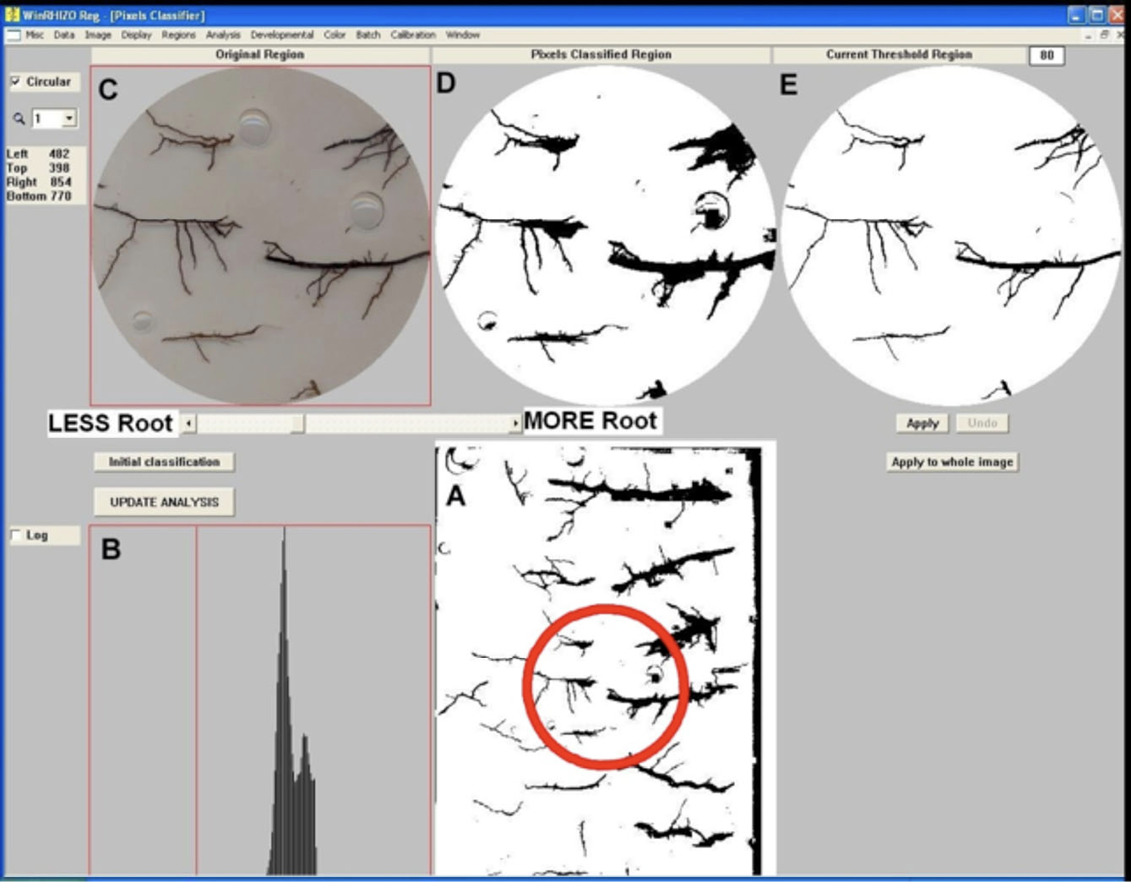 Las imágenes de WinRhizo® permiten verificar el diagnóstico visual del estado de las raíces realizado en el campo y cuantificar el número, diámetro, longitud, superficie, volumen, densidad (cm/cm3) y orden topológico (ramificación, ángulo de inserción, longitud inter-lateral, dirección del crecimiento, número de puntas o “tips”) de las raíces. El output de WinRhizo® complementa parámetros como el peso fresco y seco de las raíces y otras observaciones como el color, firmeza, flexibilidad, consistencia, porosidad, deciduosidad y longevidad.