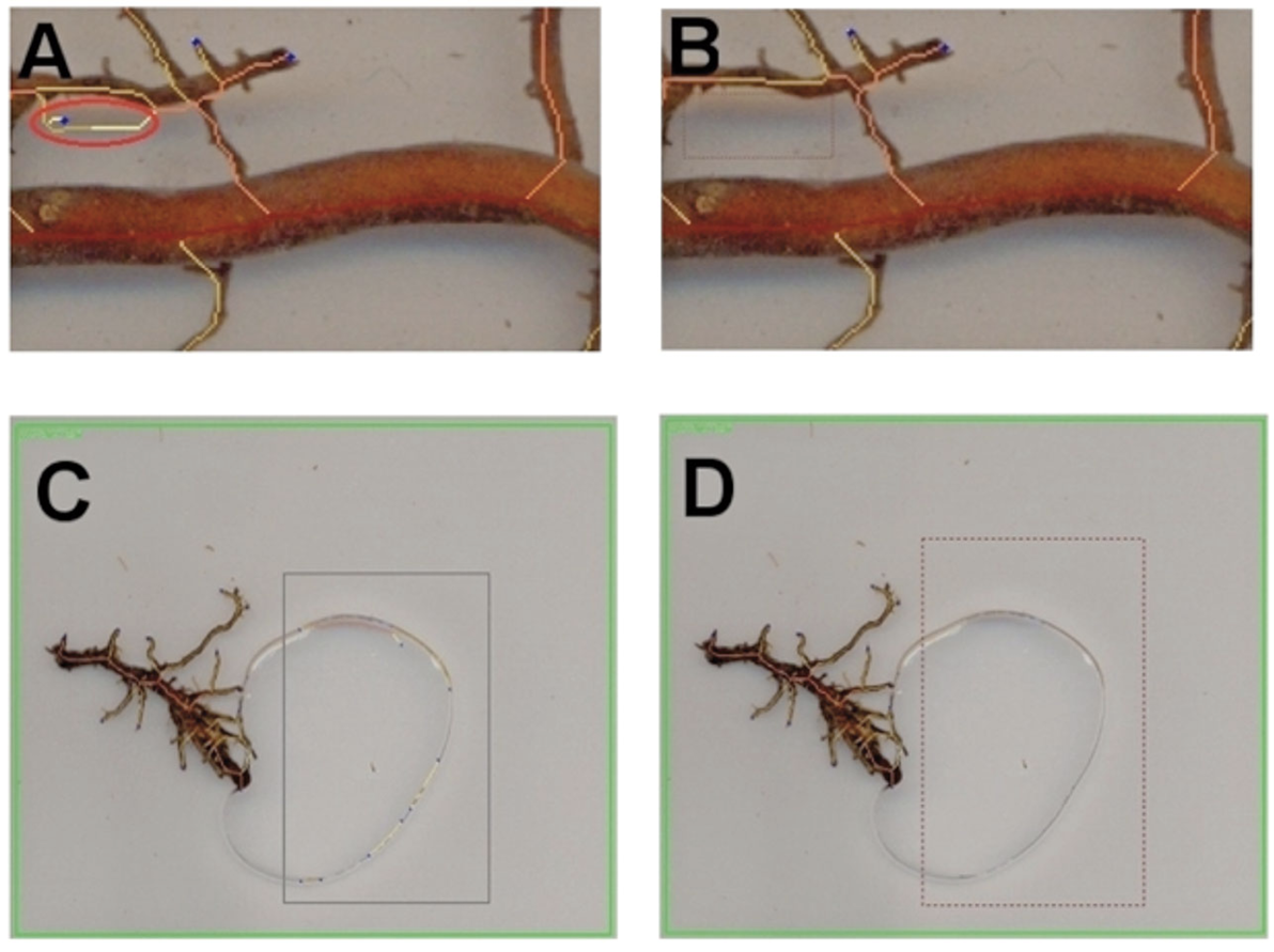 Las raíces pueden ser teñidas antes del escaneo sumergiéndolas en una solución de rojo neutro natural (0,16 g/l), luego sometiéndolas a enjuague por 30 min y almacenándolas en el refrigerador en el compartimento de los vegetales hasta el escaneo. Es preferible utilizar WinRhizo® con un escáner doble para la adquisición de la imagen, porque ilumina las raíces desde arriba y abajo y se reduce la formación de sombras en las imágenes. En los manuales de WinRhizo® esto se denota como “Dual Scan”. Además, el “Régent Positioning System” permite la colocación consistente de las bandejas, lo que evita tener que hacer una prevista de cada imagen antes del escaneo. Las raíces deben ser escaneadas a color utilizando una resolución de 200 ppi y archivadas en formato jpg.