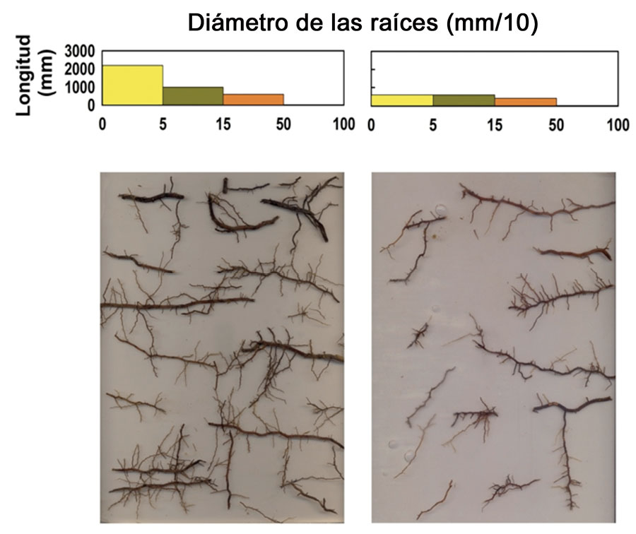 Estos atributos estructurales y funcionales son de importancia para evaluar la cantidad y la calidad de las raíces de los cultivos porque determinan en gran medida la capacidad de absorción de agua y nutrientes, y la competencia entre las plantas vecinas. El número y las clases diamétricas de las raíces pueden ser definidas por el usuario, lo que otorga flexibilidad para adaptar el software al estudio de sistemas radicales para los que ya existen metodologías de observación y clasificación. WinRhizo® ha sido evaluado en sistemas modelo (Pang et al., 2011) que garantizan la veracidad de los resultados cuantitativos producidos.