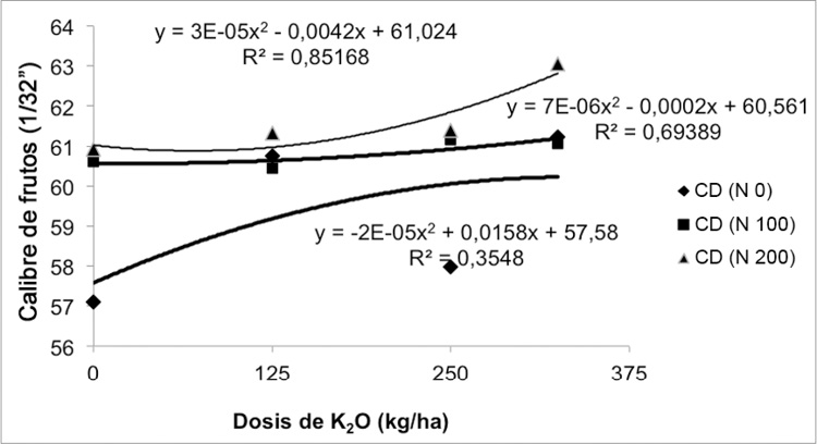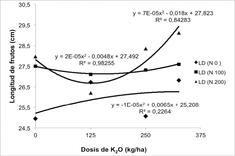 Respecto al K, en el periodo 2008-2009 no hubo respuesta en las variables estudiadas a las dosis de K2O (125, 250 y 375 kg/ha). Por el contrario, en el ciclo 2009-2010, hubo diferencias significativas en longitud y calibre del fruto central de la segunda mano (LD y CD), con CV de 6,51 y 9,26. El mejor ajuste para LD fue cuadrático, mientras que para CD fue lineal en las ecuaciones correspondientes. El valor promedio más alto en cada variable se presentó cuando se utilizó 375 kg de K2O/ha. Además para estas dos variables, en el segundo período (2009-2010), hubo diferencias significativas en la interacción K*N (LD, p= 0,0165; CD, p=0,0235), encontrándose la mejor combinación con 200 kg de N/ha y 375 kg de K2O/ha (Figuras 7 y 8). Esta interacción en estos dos elementos es similar a la obtenida por Combatt et al. (2004), ellos encontraron la mejor interacción N*K en rendimiento en plátano con 200 kg/ha para ambos elementos, expresado el K como K2O.
