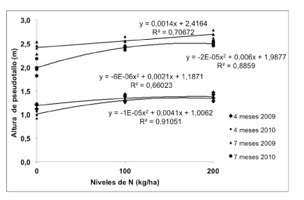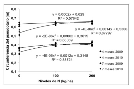 Las variables altura y circunferencia del pseudotallo (AP y GP), a la edad de cuatro y siete meses después de la siembra, presentaron diferencias significativas a las dosis de N (p<0,05), tanto en el ciclo 2009 como en el de 2010. Soto (1992), comenta que existe una correlación positiva entre la producción de biomasa y el nitrógeno (N) absorbido por las plantas, quiere decir que si el N es absorbido por estas habrá mayor producción de biomasa, mientras que aquellas plantas que no disponen de N, su contenido de biomasa es menor; esta explicación concuerda con lo encontrado en este estudio, donde las plantas con suministro de N incrementaron su tamaño respecto a aquellas que no recibieron N, en ambos ciclos del cultivo. De la misma forma estos resultados concuerdan con los encontrados por Vázquez et al. (2005), ellos mencionan que el N influye positivamente en el crecimiento de este cultivo. Las Figuras 1 y 2, muestran el comportamiento de estas dos variables.