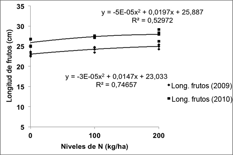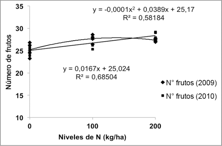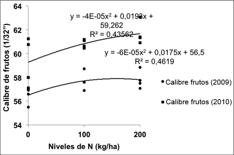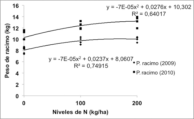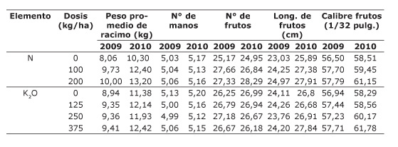 Varios autores proponen entre 200 y 300 kg/ha la mejor dosis de N para la producción de plátano, entre ellos, Espinosa y Belalcázar (1998) establecen la mejor dosis entre 210 y 280 kg/ha, López (2002) informa que el plátano requiere 250 kg/ha; mientras que para Combatt et al. (2004) establecen que la mejor dosis de N es de 300 kg/ha en el peso del fruto del cultivar Simmonds. Quizás la diferencia con estos autores, respecto a los resultados obtenidos en este estudio, se debe al material genético utilizado y a las características de los suelos donde se desarrollaron los experimentos.