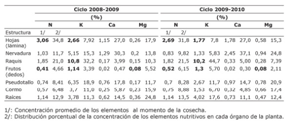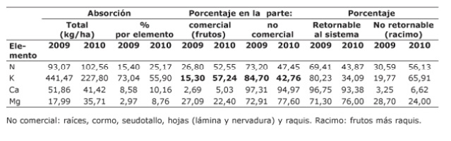 Los elementos de mayor consumo y que pueden ser limitantes en el cultivo de plátano son el nitrógeno (N) y el potasio (K) (Espinosa y Belalcázar, 1998; Combatt et al., 2004). La extracción de K puede llegar a 1,03 kg/panta; sin embargo, existe el beneficio que de este elemento se retorna al suelo del 85 al 90% de lo absorbido y almacenado en las raíces, cormo, pseudotallo y hojas. Muñoz (1995), menciona que en plátano, el retorno en general de nutrimentos al suelo es entre 74 y 78%.