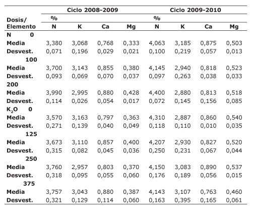 Los resultados del análisis de tejido hecho a la lámina de las hojas, al inicio de la floración, muestran que la concentración de N aumentó conforme las dosis de N aplicadas (Cuadro 4), lo que puede estar relacionado con las respuestas positivas de este elemento, tanto en las variables de crecimiento como en las de rendimiento analizadas en ambos ciclos o períodos de producción del cultivo. Por el contrario, la concentración de K, al inicio de la floración, en el primer ciclo de producción (2008-2009) es variable respecto a las dosis aplicadas de este elemento, ciclo en el que no hubo respuesta a la aplicación del K, pero en el segundo período del cultivo (2009-2010), aunque con incrementos mínimos, la tendencia es a aumentar conforme las dosis aplicadas de K (Cuadro 4), en este ciclo sí hubo respuestas significativas a este elemento en las variables LD y CD.