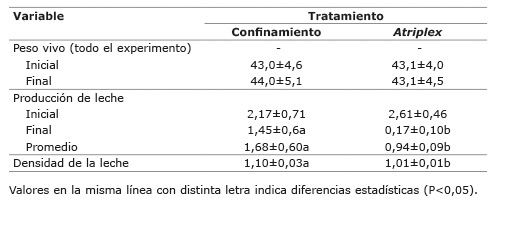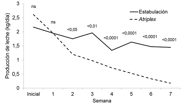 La reducción observada en la producción de leche era de esperarse, pues el forraje de Atriplex, aunque contiene elevados niveles de proteína (Urrutia et al., 1989; Guerrero et al., 2010), por sí solo es incapaz de satisfacer los altos requerimientos de energía de las cabras con producciones de leche elevadas (Valderrábano et al., 1996; Abu-Zanat y Taba, 2004). Estos resultados indican que el forraje de Atriplex, como principal o única fuente de nutrientes, puede ser utilizado casi exclusivamente como dieta de mantenimiento.