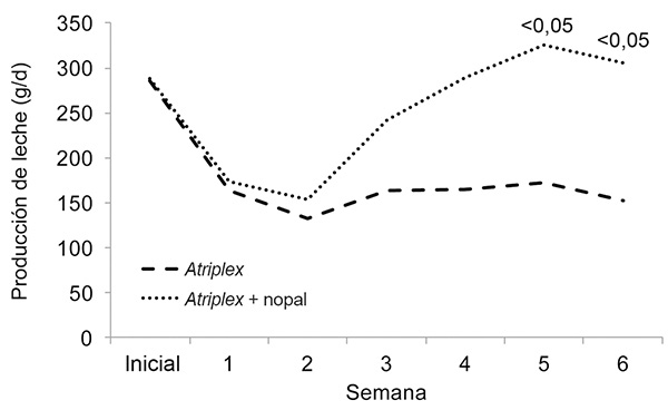 Las cabras que recibieron nopal (experimentos 2 y 3) mostraron una producción de leche de casi el doble de la producción registrada por aquellas que se alimentaron sólo con Atriplex, lo que sugiere que el consumo de nopal originó incrementos en el consumo total de materia orgánica digestible (Ben Salem et al., 2005; Ben Salem et al., 2010). Resultados similares se han observado en ovinos alimentados con dietas a base de pajas en los que el consumo de materia seca proveniente de paja se incrementa conforme se eleva la proporción de nopal en la dieta (Ben Salem et al., 1996).