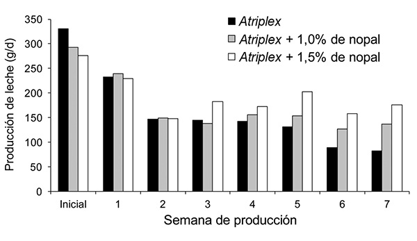 En los experimentos 2 y 3, la inclusión de nopal evitó que los niveles de producción de leche se redujeran en la misma proporción que lo ocurrido en los grupos de cabras alimentadas exclusivamente con Atriplex. Estos resultados pueden atribuirse a la sincronía entre los carbohidratos solubles del nopal (Ben Salem et al., 1996) con el nitrógeno soluble del Atriplex (Ben Salem et al., 2002c; Ben Salem et al., 2010), lo cual no concuerda con los resultados obtenidos previamente con corderos en crecimiento alimentados con Atriplex (Ben Salem et al., 2005), en los que se observaron aumentos de peso cuando se incluyó nopal en la dieta.