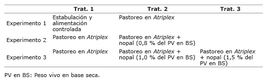 Se realizaron tres experimentos con cabras adultas de la raza Nubia, lactantes y no gestantes, durante los meses secos, entre mayo y agosto de 2005 y entre mayo y junio de 2006. En el primer experimento se compararon dos sistemas de alimentación para evaluar el potencial de Atriplex como principal fuente de nutrientes para producción de leche en época seca del año: AT) mantenidas en una plantación de Atriplex y CO) mantenidas en confinamiento y alimentación controlada (tratamiento control). En el segundo se aplicaron dos tratamientos para evaluar el uso de la penca de nopal como suplemento en cabras lactantes alimentadas con Atriplex: AT) mantenidas en una plantación de Atriplex y NP) similar a AT más nopal (0,8% del peso vivo (PV) en base seca (BS). En el tercero se aplicaron tres tratamientos para evaluar el uso de niveles crecientes de penca de nopal como suplemento en cabras lactantes alimentadas con Atriplex, bajo el supuesto de que el mayor consumo de agua y azúcares solubles contenidos en el nopal promoverían un mejor aprovechamiento del forraje de Atriplex, lo que se reflejaría en mejor respuesta animal: AT) mantenidas en una plantación de Atriplex, NP-1,0) similar a AT más nopal (1,0% del PV en BS) y NP-1,5) similar a AT más nopal (1,5% del PV en BS). En el Cuadro 1 se resumen los experimentos y los tratamientos aplicados en cada uno.