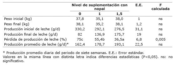 El forraje disponible por cabra fue de 4,5 kg/ d, conteniendo 16,7±2,36% de PC, 21,4±1,69% de FAD y 65,3±2,45% de digestibilidad in situ de la materia seca. La composición media del nopal utilizado fue: MS=10,25±0,9%, PC=4,69±0,27%, FAD=17,4±2,56%, fibra neutro detergente (FND)= 23,4±3,54%, celulosa=2,9±0,33%, lignina=2,2±0,21% y 2,22±0,21 Mcal de energía digestible (ED)/kg MS. A diferencia del primer experimento, el peso de las cabras en ambos grupos disminuyó significativamente en ambos grupos de cabras (P<0,05), aunque no se detectaron diferencias (P>0,05) entre tratamientos (Cuadro 3). La pérdida de peso mostrada por las cabras sugiere que el consumo de energía fue insuficiente para cubrir los elevados requerimientos de cabras lactantes, a pesar de que las producciones fueron inferiores a 300 g diarios. Las cabras suplementadas con nopal tendieron a perder menos peso (8,2% del peso inicial) que la observada en las no suplementadas (11,3%); adicionalmente, la producción final de leche fue casi el doble en las cabras suplementadas. En conjunto, estos resultados indican, por un lado, que el consumo de materia seca y de energía pudo ser mayor en las cabras suplementadas y, por otro, que la energía contenida en el nopal mejoró el balance nitrógeno:energía de las cabras, como se había sugerido anteriormente (Ben Salem et al., 2002c, 2004).