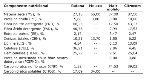 Los aditivos empleados fueron melaza, maíz molido y Citrocom (alimento comercial peletizado a base de pulpa de cítricos deshidratada), adicionados al forraje en tres proporciones diferentes, identificadas como nivel 1, 2 y 3.