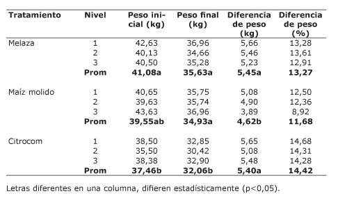 Existieron diferencias significativas (p<0,05) según el tratamiento en cuanto al peso inicial del material en cada bolsa de ensilaje (Cuadro 2), siendo posible introducir una mayor cantidad de alimento en la bolsa al utilizar melaza como aditivo (41,08 kg), y mínima cuando el forraje fue adicionado con Citrocom (37,46 kg). Se advierten también pérdidas de materia verde significativas (p<0,05) según el aditivo utilizado, hallando menores mermas cuando se empleó maíz molido con una reducción promedio de 11,68% y máximas variaciones en los tratamientos de melaza y pulpa de cítricos deshidratada los cuales contabilizaron reducciones promedio de 13,27% y 14,42% respectivamente. Por otro lado, no se determinaron diferencias importantes (p>0,05) entre los niveles de cada tratamiento evaluado.