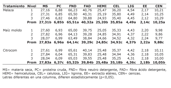 Existieron diferencias significativas entre los tratamientos para las concentraciones de proteína cruda, celulosa y extracto etéreo (p<0,05); manteniéndose en mayor porcentaje la proteína en el ensilaje con melaza (6,44%), mientras que la celulosa y el extracto etéreo presentaron mayores proporciones en el ensilaje adicionado con Citrocom (40,63% y 2,40%, respectivamente). En el caso de los contenidos de materia seca, fibra neutro detergente, fibra ácido detergente, hemicelulosa, lignina y cenizas, no se determinaron diferencias significativas entre los tratamientos analizados (p>0,05); esta ausencia de discrepancias en la composición del ensilaje final sugiere una uniformización cualitativa del ensilado al final del periodo experimental (70 días), con los tres tipos de aditivos e incluso, independientemente del nivel de aditivo agregado (Cuadro 4).