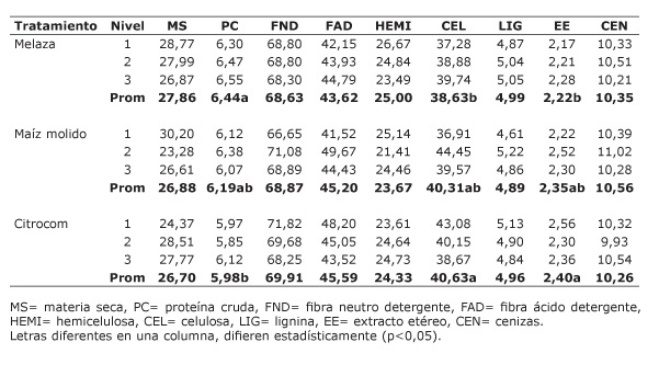 La literatura reporta valores de celulosa cuando la inclusión de aditivo fue de 4% de 38,8% y 39,2% para el uso maíz molido o melaza respectivamente, en ensilajes de un híbrido de Sorghum bicolor x Sorghum sudanefe (Nisa et al., 2008); y de 37,55% en ensilajes de Pannicum máximum Jacq. cv. Tanzania I con un 5% de pulpa de cítricos (Botega et al., 2009) concentraciones bastante similares a las encontradas en el ensayo realizado.