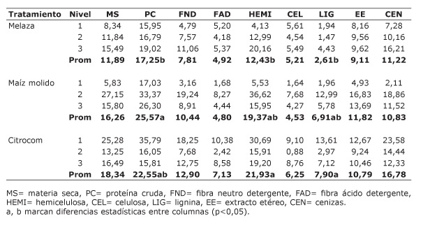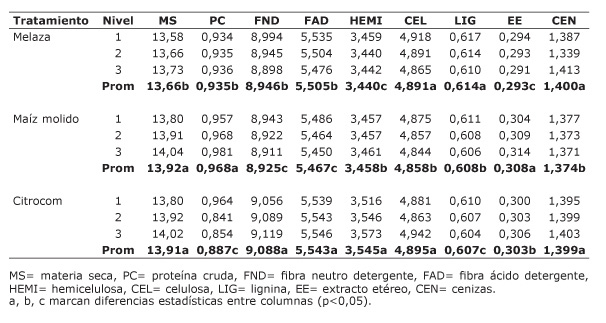 No se encontraron diferencias en la cantidad de nutrientes para cada nivel de inclusión de los diferentes aditivos (p>0,05) (Cuadro 5); mientras que si se determinaron según el tratamiento utilizado (p<0,05), siendo mayor la cantidad de materia seca cuando se mezcló el forraje con maíz molido (13,92 kg) o Citrocom (13,91 kg) que cuando se utilizó melaza como agregado (13,66 kg). El comportamiento de la proteína cruda también presentó diferencias según el aditivo empleado, siendo mayor la concentración del componente cuando se usó maíz molido (0,968 kg), media con la melaza (0,935 kg) y baja con el Citrocom (0,887 kg). Similar conducta se observó para los distintos componentes de la fibra, el extracto etéreo y las cenizas los cuales mostraron diferencias significativas entre tratamientos (p<0,05) no así entre niveles de inclusión del aditivo (p>0,05); la fibra neutro detergente y la fibra ácido detergente fueron máximas con el Citrocom, de valor medio con la melaza y mínimos con el uso de maíz molido como tratamiento; la hemicelulosa presentó niveles máximos en las muestras que incluían maíz, y fue mínima con la melaza; la celulosa y las cenizas se comportaron de igual manera, presentando cantidades estadísticamente similares con el uso de melaza y Citrocom, siendo estos mayores que cuando se utilizó maíz molido como aditivo; la concentración de lignina fue menor cuando se usó Citrocom en vez de maíz y esta a su vez fue más reducida que con el uso de melaza; por último, el maíz potenció la concentración de extracto etéreo en el material haciendo que se presentaran los valores más altos de dicho componente, mientras que el tratamiento que incluía melaza como agregado presentó los tenores más bajos observados.