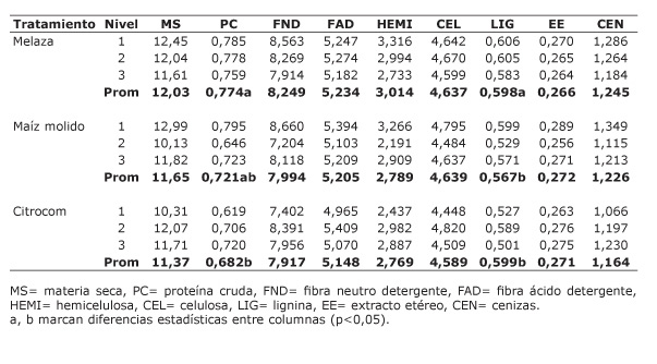Valores muy similares a los reportados en la literatura fueron encontrados en el presente estudio para la FND y FAD; Araujo-Febres et al. (1996) determinaron concentraciones de 60,24% y 40,21% para la FND y FAD respectivamente, para ensilajes de pasto elefante enano (P. purpureum cv. Mott). Nisa et al. (2008) determinaron tenores de FND de alrededor de 70% y de FAD de 42% utilizando maíz molido en inclusiones de 2% y 4% en ensilajes de Jambo grass (Sorghum bicolor x Sorghum sudanefe). En el caso del uso de Citrocom como aditivo (5% de inclusión) en ensilajes de pasto Camerún (P. purpureum Schum) se reportan valores de FAD y FND de 47,78% y 67,38% respectivamente (Pereira et al., 1999).