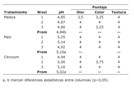 Para los valores de pH, no se encontró variación significativa entre los niveles de aditivo agregado (p>0,05), aunque si la hubo entre tratamientos (p<0,05), siendo estadísticamente menor el pH medido cuando se utilizó melaza (4,84) que cuando se utilizó Citrocom o maíz (5,02 y 5,10 respectivamente). En cuanto a las propiedades organolépticas observadas, la adición de maíz molido y Citrocom generó un olor agradable en todos los niveles de inclusión empleados, produciéndose apreciaciones similares con el uso de melaza, la cual presentó un poco de crecimiento de hongos en el nivel menor de inclusión de aditivo. El color, en general se observó como un verde pálido en todos los tratamientos que incluyeron maíz molido, similares anotaciones generó el uso de Citrocom el cual presentó un color verde pálido para los niveles de 1% y 3% de inclusión y un ligero color musgoso cuando el porcentaje de inclusión fue de 2. Cuando se evaluó el tratamiento de la melaza con un 2% de inclusión del aditivo, el color observado fue verde pálido mientras que en los otros dos niveles evaluados, el color se acercó más al verde musgo. Por último, todos los tratamientos evaluados produjeron ensilajes con una textura firme y consistente, característica buscada en un ensilaje de buena calidad (Cuadro 8).