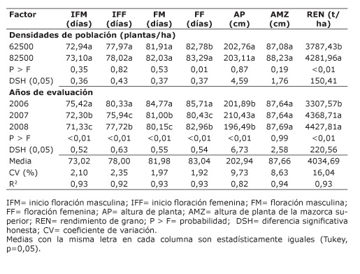 En la producción de semilla certificada se han usado varias densidades de población en función del progenitor y sitio. Para los híbridos H-33, H-34, H-48 y H-50, en la hembra usaron entre 75 y 85 000 plantas/ha y en el macho entre 50 y 65 000 plantas/ha (Rojas et al., 2009). Virgen et al. (2010) para la hembra de H-64E, H-66, H-68E y H-50 recomiendan 62 y 83 000 plantas/ha para producir entre 4,4 y 7,0 t/ha de semilla en Tlaxcala. Asimismo, Espinosa et al. (2010) para la hembra androestéril y fértil de maíz, encontraron mayor rendimiento de semilla (9640 kg/ha) con 80 000 plantas/ha en comparación con 50 000 plantas/ha (7193 kg/ha), sin observar cambios significativos en días a floración masculina y femenina y altura de planta. Por otra parte, en Jalisco y Michoacán, para la hembra se usaron entre 50 y 60 000 plantas/ha y para el macho entre 65 y 70 000 plantas/ha (Vallejo et al., 2008). Barrón (2010) señalan para los híbridos H-515 y H-516, en la región de Guerrero, recomiendan 55 000 plantas/ha para obtener 3 t/ha de semilla comercializable.