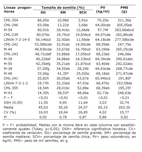 Las líneas tuvieron porcentajes promedio de tamaños de semilla grande, mediana y chica de 46, 30 y 24%, respectivamente (Cuadro 3). Las líneas CML-246, M-54, CML-239, LINVA-7-2-14-5 y CML-242 presentaron porcentajes de semilla grande mayores a 50%. El 69% de las líneas tuvieron porcentajes de semilla mediana entre 32 y 41. Las líneas CML-241, LINVA-7-2-1-2, CML-355 y M-43 tuvieron el mayor porcentaje de semilla pequeña (> 43%), lo cual no significa que esta tenga menor germinación y establecimiento del cultivo en comparación con la semilla grande. Varios autores confirman que no hay diferencias significativas entre tamaños, solo una diferencia en la emergencia entre dos y tres días y el tamaño de la plántula al inicio del cultivo (Veera et al., 1998; Pérez et al., 2006). La mayoría de las líneas tienen tamaño de semilla entre mediano y grande, cribas oblongas de 7 y 8 mm, respectivamente; parámetro básico para la siembra mecánica y el establecimiento rápido y uniforme del cultivo (Copeland y McDonald, 2001) en un lote de producción de semilla híbrida.