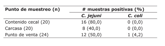 De las 84 muestras analizadas, 44 (52,38%) resultaron positivas para Campylobacter sp. a nivel de género por microbiología tradicional. El 81,81% de los aislamientos (n=36) fueron confirmados por PCR especie-específico para C. jejuni y C. coli. Solamente una muestra (1,2%) se confirmó como Campylobacter coli (Cuadro 1). Se observó una frecuencia similar de aislamientos en carcasas respecto al contenido cecal, aunque la frecuencia de aislamientos volvió a incrementarse en el punto de venta. En este último nivel, una muestra reveló presencia de ambas especies C. jejuni y C. coli (Cuadro 1).